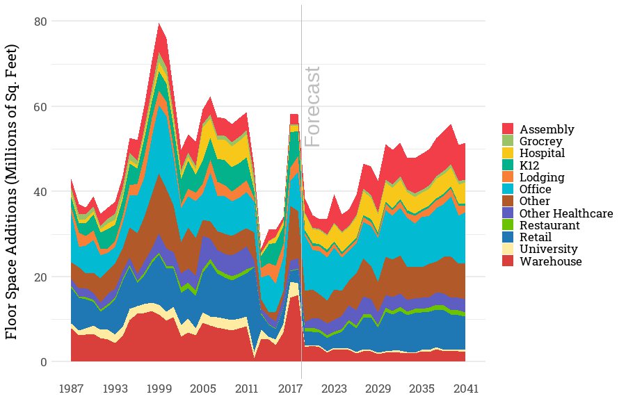 Since recovery from recession, our current estimates show an average annual addition to floor space of about 51 million square feet. During Action Plan period, 2022-2027 we expect a more moderate annual additions of about 38 million square feet. The longer-term forecast for floor space additions do show a wide swing in construction activities. However, these swings in construction activity are not due to business cycles but rather due to changing demographics and changing commercial trends.