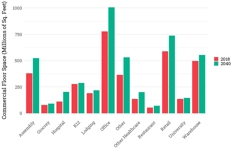 The key economic driver for the commercial sector’s energy demand is the square footage needed for commercial enterprises. In modeling this sector, the Council calculated the space requirement of thousands of business activities and aggregated these into 17 different building types.
