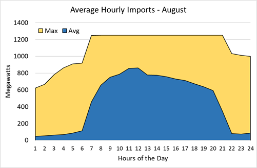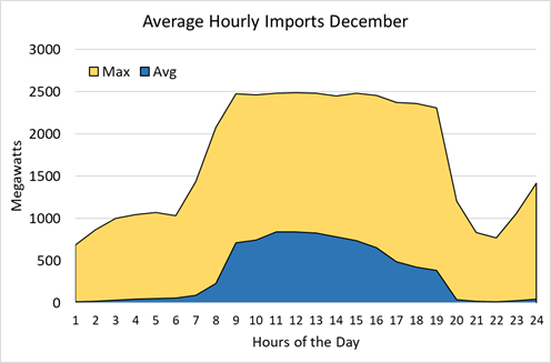 The figures below show redeveloped GENESYS results for average energy imported over each hour of the day and maximum energy imported over each hour of the day in December and August. Please note that the scales in the charts below are different. Imports in December are limited to a maximum of 2,500 megawatts per hour and in August to a maximum of 1,250 megawatts per hour. These limitations are recommended by the Resource Adequacy Advisory Committee.