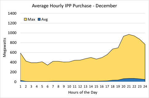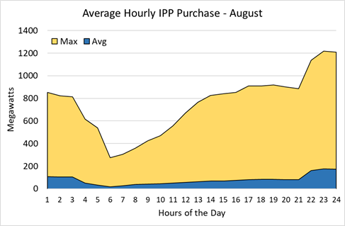 The second source of market supply is from regional independent power producers (IPP). The in-region market is mostly comprised of gas-fired generators with an aggregate nameplate capacity of about 2,400 megawatts. Even though these resources are physically located within the Pacific Northwest region, their generation is available to anyone. Figures below show the redeveloped GENESYS results for average and maximum hourly energy purchased from IPP resources in December and in August. On average (blue area), very little IPP energy is purchased, however, in the highest hour (out of 180 simulations) IPP generation was about 1,000 megawatts in December and about 1,200 megawatts in August.