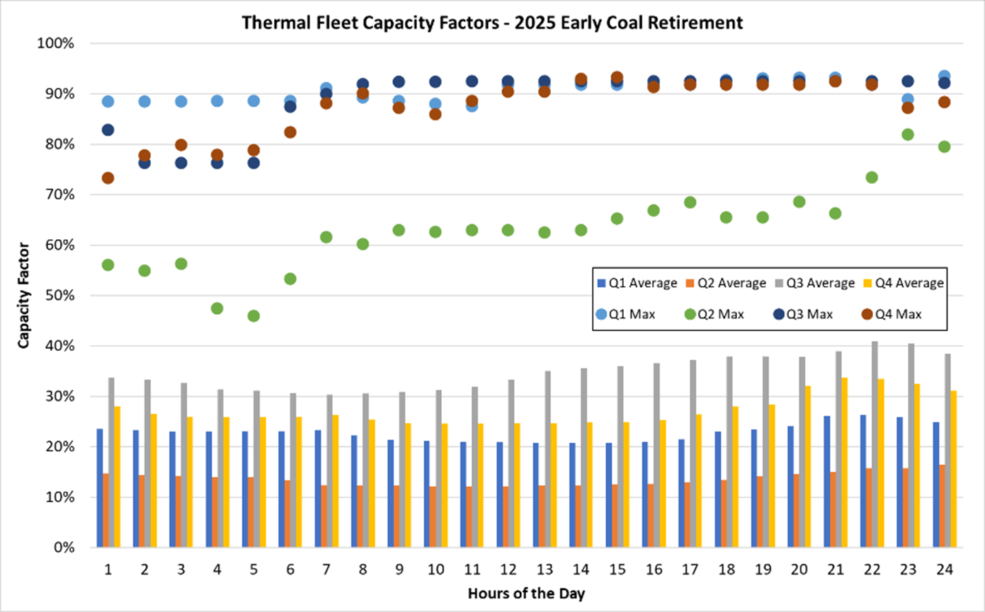 The figures below show thermal fleet average and maximum hourly capacity factors by quarter for both the 2025 reference and early retirement cases. Average hourly capacity factors range from 12 to 50 percent, which translates into a range of 5,400 to 9,500 megawatts of unutilized capacity for the non-retired thermal plants – much more than is needed to offset retired coal plant capacity. However, comparing expected availability of unused thermal capacity to the fixed amount of retired capacity does not provide a good indication of how resource adequacy is affected.