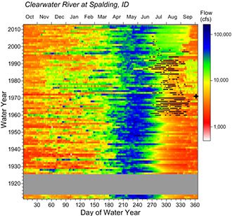 Raster-based plots (such as raster hydrographs) offer an innovative approach to examining intra- and inter-annual variations in time-series datasets. A gridded graphing approach is used with years as x-values, days as y values and z-values as the magnitude of a grid cell. The resulting raster graphic can be interpreted much like a map, with patches and discontinuities representing seasonal and annual hydrologic patterns. This technique permits new insights into characteristics and disturbances of hydrologic properties and provides additional tools to aquatic ecologists and scientists studying the physical hydrologic environment. This approach also allows hydrologic properties to be identified as patterns within the raster hydrograph. An advanced time-series analysis method using GIS-like techniques will be discussed with examples provided to the participants.