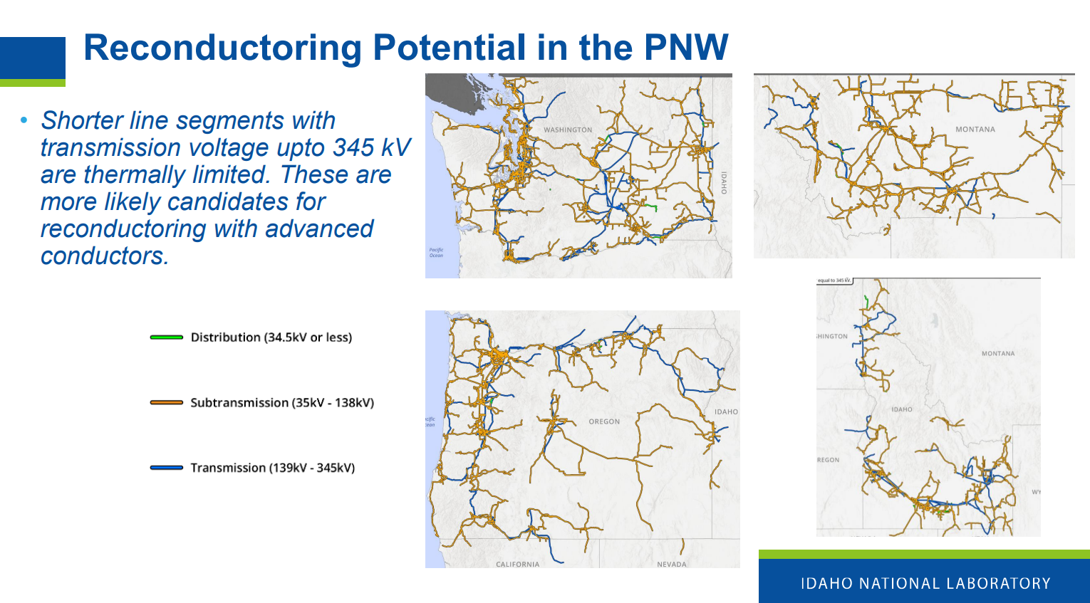 He showed maps INL has produced analyzing the potential for advanced reconductoring in Oregon, Idaho, Washington, and Montana, noting that shorter line segments up to 345 kilovolts are best suited for upgrades with advanced conductors.