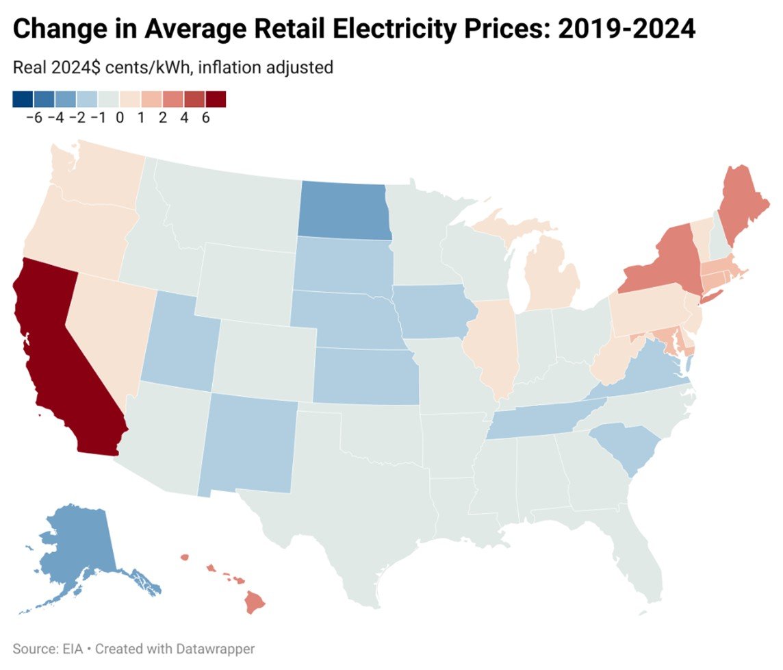 Hledik explained that at the national level, the average nominal price of electricity has grown from 9.8 cents per kilowatt-hour in 2010 to 12.9 cents/kWh in 2024. However, this does not account for inflation. The inflation-adjusted price in 2010 was 14.1 cents/kWH, and it has declined to 12.9 cents/kWh in 2024. The study relied on EIA data, and represents the “all-in” price, equivalent to total customer bills (including volumetric, demand, and fixed charges) divided by total retail electricity sales, and covers all costs associated with the provision of retail service (generation, transmission, and distribution).