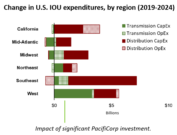 Comparing the West to other U.S. regions, investor-owned utilities had second-highest growth in expenditures related to the transmission and distribution system between 2019-2024. They had by far the highest growth in transmission system capital expenditure, reflecting significant investment made by PacifiCorp.