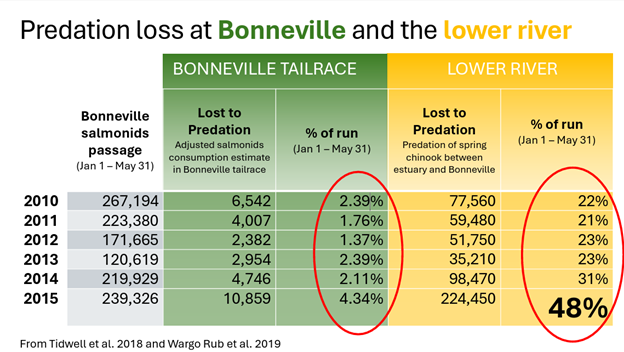 According to some studies, losses of spring Chinook to sea lion predation are in the range of 20-25% and could rise even higher in some years. However, for some of the years with the highest estimates- such as 2015, when loss of spring Chinook between the estuary and Bonneville due to pinniped predation was estimated at a whopping 48%- the researcher noted that the kind of tag being used to track fish may have actually been attracting pinnipeds, complicating survival rate reporting.